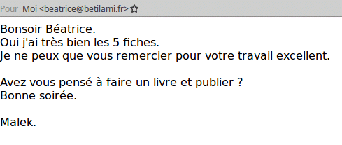 Marie vient de terminer le défi et m’écrit : » Un immense MERCI à vous de nous avoir lancé tous ces beaux défis et nous faire réaliser que le lâcher prise par rapport au quotidien qui nous dévore est important pour se retrouver et prendre un peu de bon Temps pour soi….rien que pour soi…C’était une belle aventure, et surtout une superbe rencontre avec vous…Merci d avoir pris le temps de nous conseiller nous accompagner et répondre avec autant de gentillesse à nos mails !!Je vous souhaite le meilleur pour tous vos projets en cours et à venir…Et demain….vous nous manquerez…mais ouf! votre blog restera le lien qui nous réconforte et nous aiguille dans la bonne direction…Merci pour tout….🙏Bien amicalement 👌Marie😍😘 »